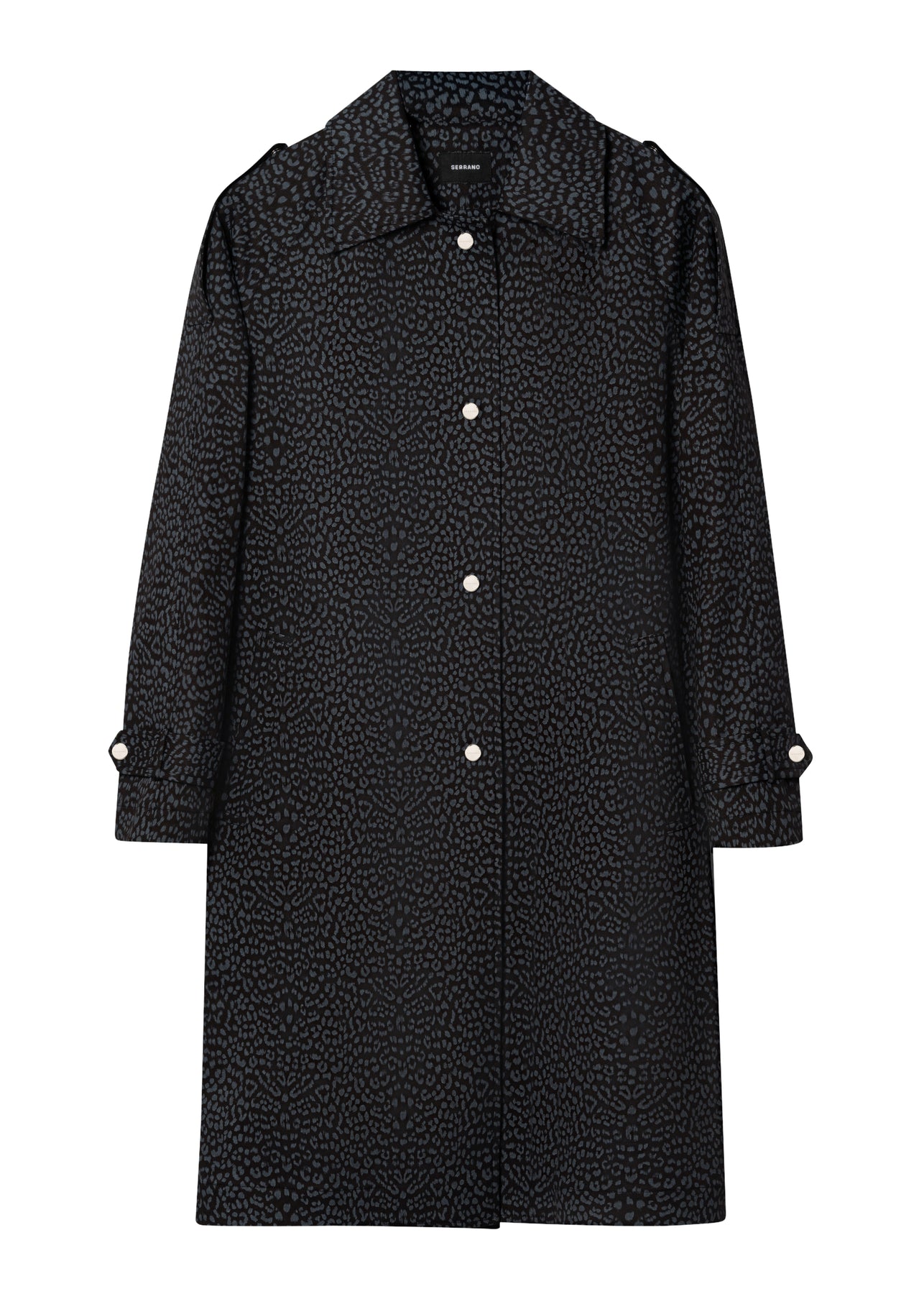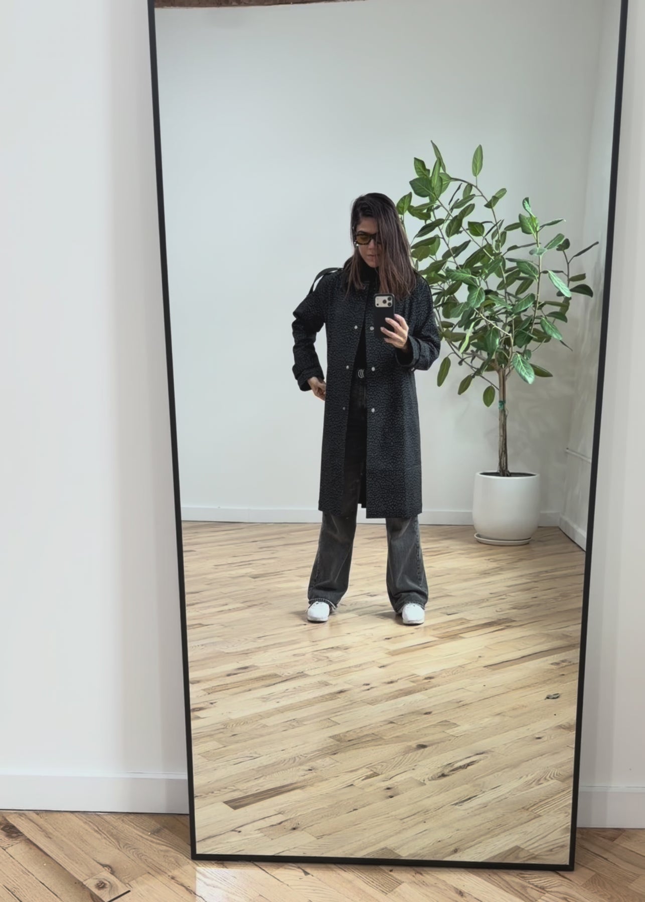 Bold and beautiful leopard print trench coat. A chic leo print design in black and gray tones. Style it endless ways: with T-shirts and jeans, turtlenecks and tailored pants or dresses. It is a perfect piece for dressing up and down.